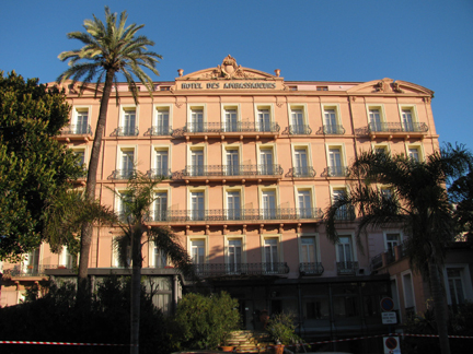 I have fond memories of a stay at Les Ambassadeurs in Menton, a hotel that I referred to in that guidebook as “the most reasonably priced 4-star on the coast.” I wrote that it had a “noble Victorian façade and wrought-iron balconies” and that its 54 rooms were decorated with a “pleasing pink, peach and green style of an indefinable period that must be ours.”