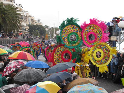 It rained in Menton on the afternoon I went to see the Corso parade, where colorful bands and dancers parade between floats decorated with lemons and oranges.