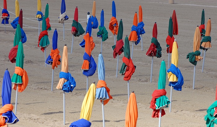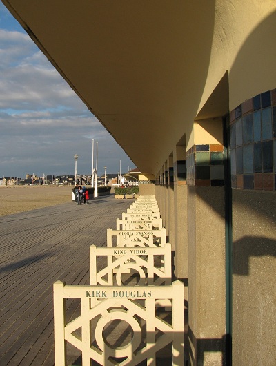 Deauville’s American Film Festival draws stars and novas to town in September. The walk of fame is along the boardwalk, with famous names of the screen noted by the changing booths. The view colored umbrellas on a long and wide stretch of beach sand is shorthand for Deauville. But the water on the English Channel is cold and the clouds move in fast. No American in his or her right mind would come to Deauville for a lie on the beach, attractive as it may be, though the British would.
