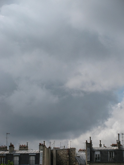 Personally, I’m sick of it. Of course, if you read the blogs you know that it’s socially incorrect for an American to be sick of anything in Paris. Paris is perfect at every moment, they say, and we should be cheerful all the time and say that we ♥ Paris day in day out. Well I don’t heart Paris when it’s grey for all of June and July! And I don’t heart Paris when there are steel wool clouds overhead in August. If we’re going to suffer the consequences of global warming at least let me get a tan!