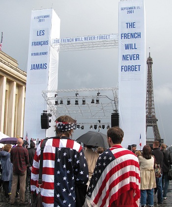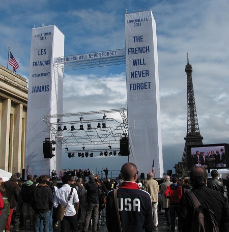 Paris, September 11, 2011. With the Eiffel Tower as backdrop behind two 80-foot replicas of the Twin Towers, an American and a French flag flying to either side, France commemorated the 10th anniversary of the attacks on the United States by the Islamist Fundamentalist network al-Qaida today with a ceremony in Paris organized by the association “The French Will Never Forget.”