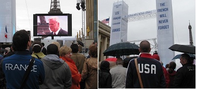 Today’s two-hour ceremony was held on Place des Droits de l’Homme, Square of Human Rights, at Trocadéro on a rainy afternoon in real time with the events on the East Coast, six time zones away.
