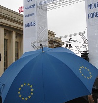 Several men in the crowd had American flags draped over the shoulders. Someone had a large light-blue European Union umbrella. One man had a USA sweatshirt. Another had a France sweatshirt. The latter two did not appear to know each other.