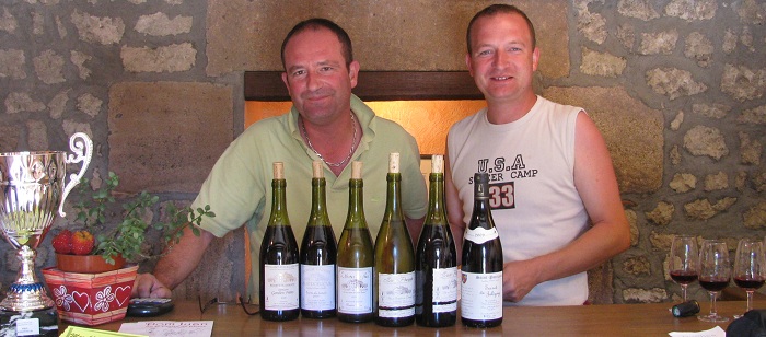 Friends in Paris had served as an aperitif a nice white Saint Pourcain produced by the Laurent family a few days before this trip, but here I visited Domaine Gardien, operated by the Gardien brothers Olivier (left in photo) and Christophe (right). The domain consists of 21 hectares (52 acres) of vines in the northernmost area of the Saint Pourcain production zone. The soil of their vines is clay and flint, often with white pebbles on the topsoil.
