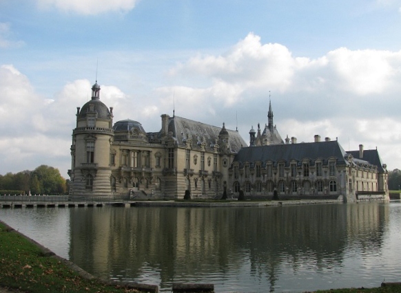 Actually, it’s difficult to figure out which is the side and which is the front of Chantilly because the building lacks symmetry. The chateau is in fact comprised of two connected buildings, one a 17th-century palace, the other a 19th-century museum/chateau built on top of the remnants of a medieval fortified castle.