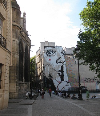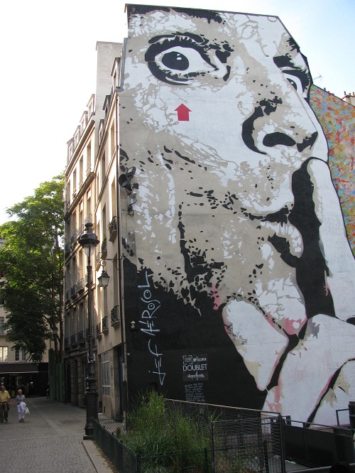 It was early August. I rode to the Beaubourg quarter on a public bike and parked at the Velib station on rue Saint Merri. As I turned to walk up the street I was surprised to see that the entire wall of a 5-story building was covered with the image of a face of a man with a finger to its lips.