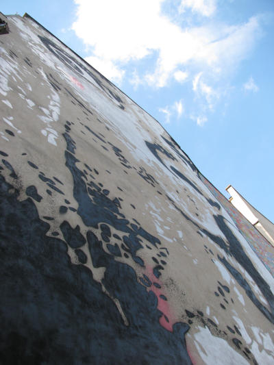 I was standing by a rail to read the words on the mural and I now had the reflex to look over it. On the other side a woman was squatting down in the corner in a small dip in the pavement. She was right below me, looking up. Her jeans down to her knees and she was peeing. I could now hear the sound of her stream against the pavement.
