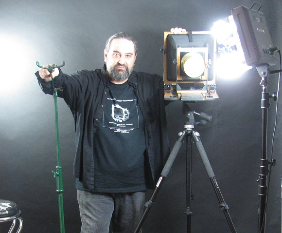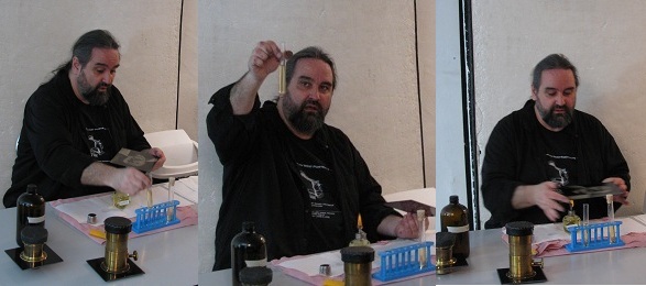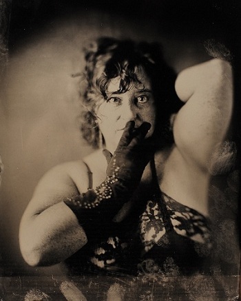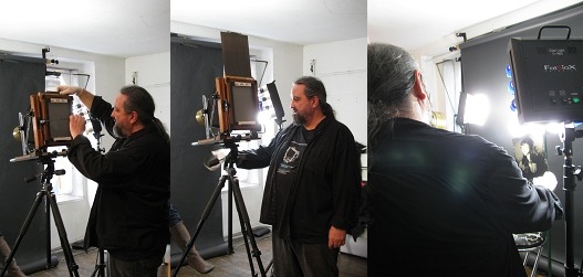 Quinn Jacobson gave a demonstration of the collodion technique prior to the opening and will be giving other workshops and photographing individuals at times during the run of the show (see schedule below). Watching him prepare his subject, introduce plates, count the seconds of posing time, pull out vials of his chemical mixtures, pour liquids onto the plates, and heat them to the point of nearly burning his fingers, comment on the serendipitous nature of the technique, and hearing him tell how he came to love one of his glass plate portraits that had been accidently shattered to many pieces that were then put together, it is clear that Jacobson is not a point and shoot kind of guy.