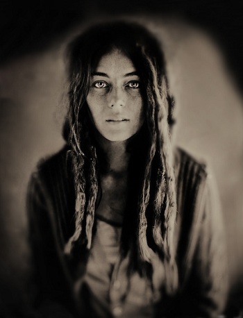 Sitting for portraits, Jacobson says, his subject do indeed imagine themselves in 19th century photography and positions, such as a fiddler holding his instrument like a rifle. Strangely, it’s only a blind woman who is clearly from a more recent area due to the fluffy light-colored blouse she’s worn for her portrait. Otherwise, the portraits can be transposed to the Wild West, even if their titles clearly place them in the present, such as “Rap promoter” or “Jewish punk rocker.”