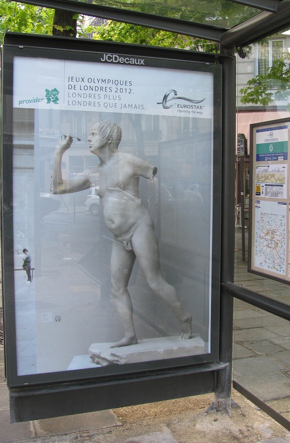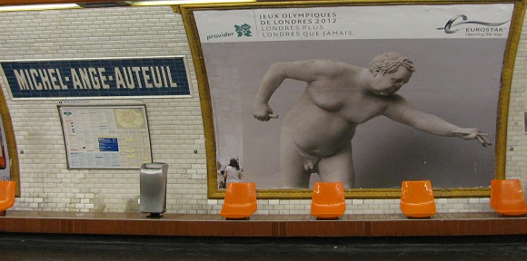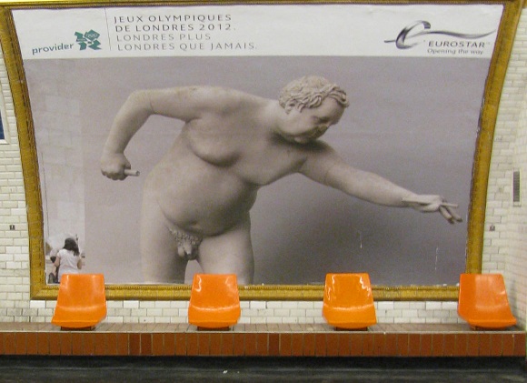 Paris, June 2012 — Michelangelo it ain’t, but this ad poster for taking the Eurostar to London for the Olympics, now showing in the Paris metro and bus system, manages to make fun of the English, refer to great art, and show genitalia. What more could a Parisian want?