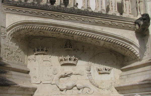 Francois (born 1547, reigned 1515-1547) inherited the throne when his cousin Louis XII died without a son, though he did have a daughter, Claude, who had grown up at Blois and who Francois married. Not to be undone by the porcupines, Francois displayed a great many fire-breathing salamanders on the wing that he built, including this one that I encountered on the novel outdoor staircase.
