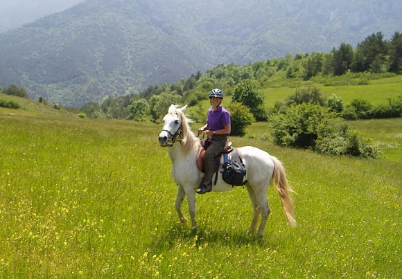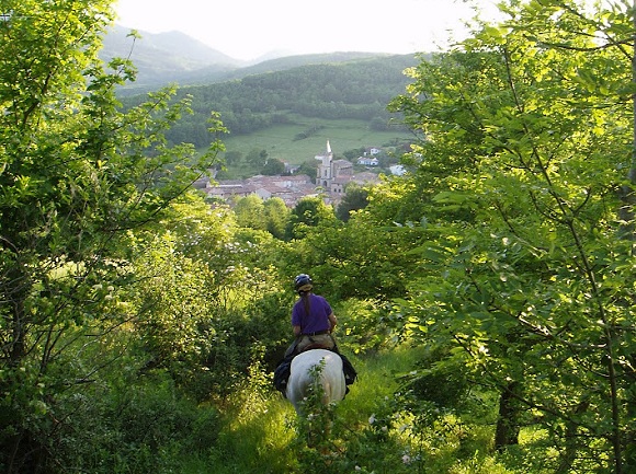 Clean and rested, we set off, and Iadj seemed happy to be traveling on solid ground again. I experienced my final bit of relief as we moved off into a steady trot, with none of the head bobbing that would indicate a limp and therefore an injury. We rode through thickly wooded trails until we reached a clearing from where we looked down upon the red roof tops of a town in the valley and then rode through an old stone village, grey except for the brilliant blue shutters framing each window.
