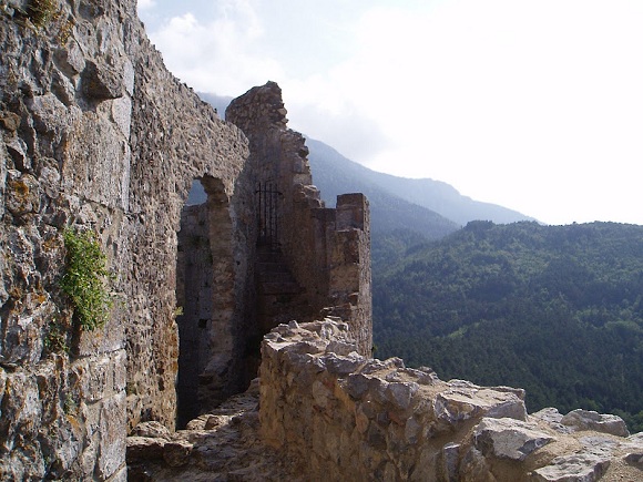 Charly and Nicole from the Ferme Equestre, where we’d rented our horses for the week, had provided us with two well-mannered and willing mounts, a series of maps, and reservations at an assortment of inns, farms, and lodges. This was our third day of leaning forward over our horses’ withers as they carried us to mountain-top vistas and down again on steep rocky tracks. We hiked alongside our steeds when the trail was too difficult. Dark narrow paths through woodland opened up into sunny fields of cerulean flowers where we dismounted to open and then close behind us pasture gates. Footpaths along clear quiet streams led us to 17th-century mountainside villages where church bells rang over the steady beat of our horse’s hooves. On this day we had looked forward to tying our horses in the courtyard of the ruins of the 10th-century Castle of Puylaurens, where they would rest while we walked under still-standing stone archways to view the valley below through ancient windows built into a wall fused to a cliff.