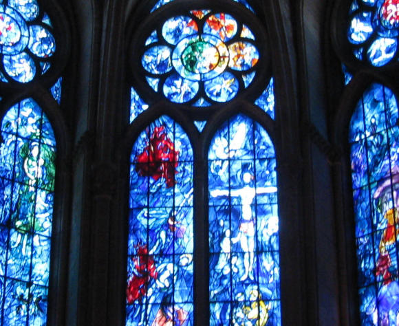There are lots of 20th-century windows here because of war damage, including the bright blue windows that draws your gaze the far end of the cathedral when you first enter were created by Marc Chagall in 1974.