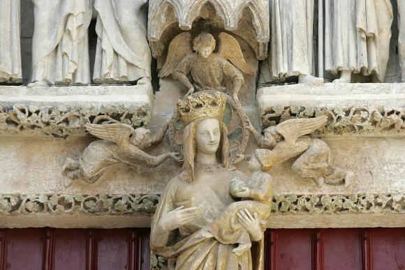 For the quality and drama of its sculptural works inside and out, Amiens is a remarkable monument to the talents of 13th century sculptors. Among its most celebrated details are the cartoon-like images of Hell on the central door, the crying angel behind the choir that came to be dear to soldiers visiting during the First World War, and the Golden Virgin which has been brought inside from its original pedestal on the southern entrance, where a copy now stands.