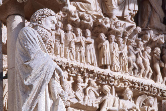 Along with its architectural prowess, the cathedral reveals a treasure chest of biblical, spiritual, political, and local anecdotes in stone, wood, and glass, all in tip-top condition thanks to cleaning and restoration in the 1990s. That work brought to light evidence of the extent to which the sculptures on the facade were painted in the Middle Ages. We often think of these medieval churches as being the color of the naked limestone, but in fact they were highly colored. An impressive 40-minute sound-and-light show (after nightfall in spring and summer and again in December) projects estimates of the original colors on the façade. Reims and Chartres also have sound-and-light shows against the façade of their cathedrals.