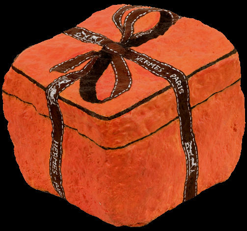 There’s a good bit of irony in the use of some of the logos and trade dress that he reproduces. Some of them are amusing enough but failed to draw me into the conversation between the corporate intent for the image and the artist’s reuse of those images and trade dress. But in many cases the rendering makes such effective use of the medium’s surface and weight that I willingly lingered, as with this exquisite, 2-kilogram (4.4-pound) Hermes gift box.