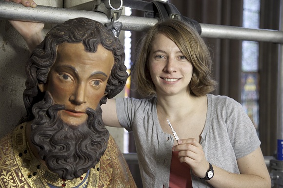 Twelve prizes were given this year in ten categories, seven involving restorations (chapels, frescoes, statuary, civil buildings, paintings, furnishings, stained glass), one for a creation, one for some aspect of a new religious edifice, and one for a young artisan. This year’s prizewinning artisan is Fanny Kurzenne, who specializes in the restoration of works in stone and also has an interest in polychromy and the preservation of 19th-century plaster copies.