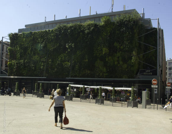 The wall above the main entrance to Les Halles d’Avignon, the indoor food market, on Place Pie, is covered by a vertical garden, the work of Patrick Blanc, a French botanist responsible for the creation of many such gardens around the world.