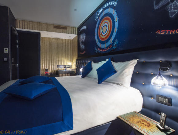 When Sandra and Jean-Michel Abecassis wanted a makeover for their Right Bank hotel near Parc Monceau, they enlisted Sandrine Alouf, a designer who’d already created hotels where guests can sleep on clouds (Hôtel One By the Five, 2008); play can-can with Moulin Rouge dancers (Hôtel Secret de Paris, 2009); and commune with Piaf, Sartre or Jean Seberg (Hôtel Montmartre Mon Amour, 2012).