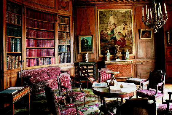 Rooms specially designed to receive Moïse de Camondo’s growing collection are fitted with antique wood paneling and present marquetry, inlaid tables and other furnishings by great names of French cabinetmaking in the latter decades of the 18th century, such as Oeben, Riesener and Jacob, along with paintings, bronze clocks, vases and chandeliers. Methodical in his purchases and with a sense of symmetry in his home, he often purchased items in pairs. The pieces often have a known history relative to high aristocracy or royalty, such as Marie-Antoinette’s chiffonier, a table for her needlepoint work. A room off the dining room was built to showcase Moïse’s porcelain collection, including two Sèvres dinner services (“Service Buffon”), each piece of which is illustrated by a different bird.