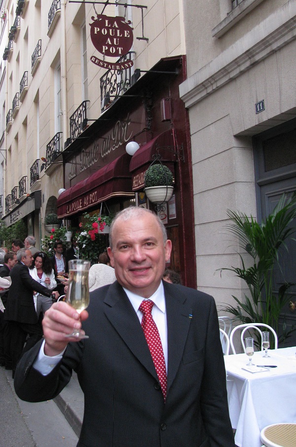 “The best peasant food I ever ate” is how a friend described his meal here, and that’s precisely why Paul Racat, owner of this all-night, uber-traditional bistro since 1974, has been honored by the City of Paris with its Médaille de Vermeil and by France in being named Chevalier de l’ordre du mérite agricole. If, like me, you’ve ever had a midnight yearning for a restorative bowl of most excellent French onion soup (la soupe gratinée au vin blanc), accompanied by a glass of white wine, perhaps an upside-down apple pie (tarte Tatin) to round off the supper, then a late-night (or very late-night) stop at La Poule au Pot will be one of your most memorable Paris restaurant experiences. Ditto for yearnings for escargots, bone marrow, fried camembert, chicken and rice with a cream sauce, steak tartar, chicken in a pot (poule au pot Henri IV), veal kidneys, salmon, lamb, crème brulée, profiteroles… The décor has been largely unchanged since La Poule au Pot opened in 1935, other than the hundreds of small plaques bearing the names of stars of music, film and theater who have also slid into the banquettes here to enjoy traditional bistro fare and some of the friendliest deadpan service in town.