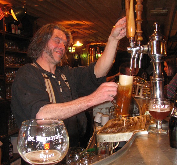 Philippe Boudart, captain of this bar-barge since 1997, looks like Hugh Jackman pouring beer at a 20th–anniversary celebration of the first X-Men, both dangerous and lovable. He and his barge are legendary in Charlie-M’s beer-drinking circles. I stood up to the tin bar in the hold of the old grain barge and introduced myself to Boudart as a traveler in search of a beer education.