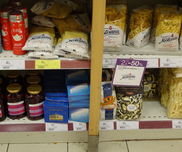 The “World” section did, however, have Sabbath candles (bottom shelf, blue box in the photo). I thought this odd given that there’s a candle section on the opposite side of the store. I then realized that it wasn’t so odd since they were next to Italian rice and pasta even though the store has large rice and pasta sections. The logic is that a customer would go to the “World” section to look not for rice or pasta but for Italian goods. The Sabbath candles, made in Israel, are therefore considered at this grocery store as national rather than religious items, as though one might want to serve Italian pasta, Spanish olives and Chinese tea light by Israeli candles.