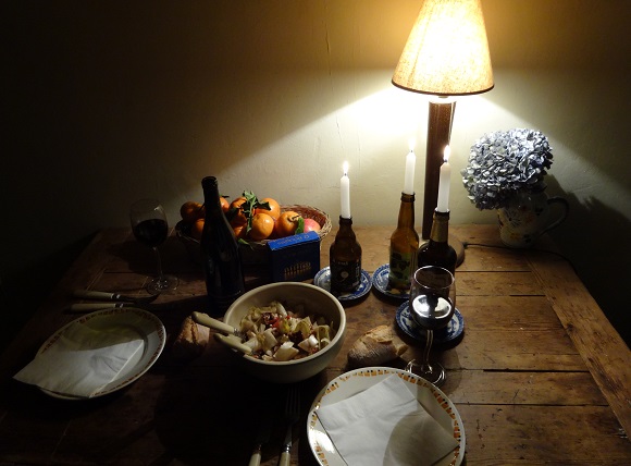 The meal was mostly Italian but with a nod to what I already had in my refrigerator, along with a domestic wine imported by my guest and brandy from a war tour in Normandy—an delicious well-accompanied amalgam of sorts, with candles and cadavers to spare.