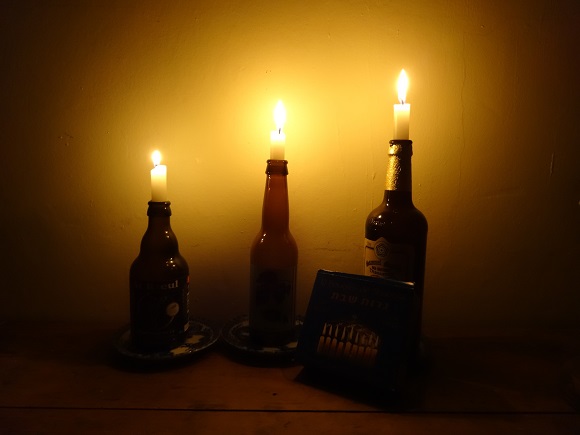 I realized that I didn’t have any candle holders for the Sabbath candles. Then I realized that I did: cadavers, as the French call empty bottles, from a recent craft beer tasting.