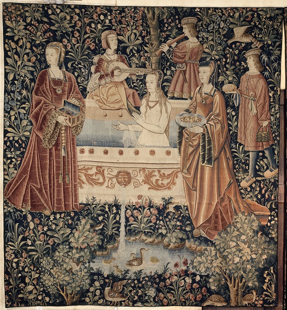 La Toilette: The Invention of Privacy, in which la toilette refers to acts of washing and grooming, opens with an early Renaissance tapestry from the Cluny Museum—The Bath—depicting a blonde noblewoman clad in her headdress and jewels (but nothing else) enjoying a refreshing summer-time dip in the garden, accompanied by servants, musicians and attendants of both sexes.