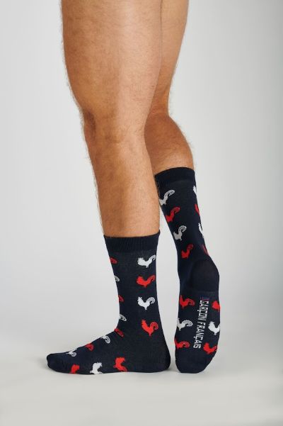 Xavier Sauzay and Guillaume Deniau date their interest in entering into the sock trade to a semester abroad in Asia, where they discovered the popularity of socks as fashion in Shanghai, Seoul and Taipei. Returning to France, they also noticed that the Made in France textile trend was then underway. At the age of 26, they launched Label Chaussettes in 2019. Their brand has two major elements: on the one foot, cheery and colorful socks designed by artists, and on the other, logo socks for which they partner with such brands as La Vache Qui Rit (Laughing Cow processed cheese), France Rugby, Asterisk, Monsieur Madame (Mr. Men), and the French Navy. Their socks are made in the Limousin region of France, specifically in the factories of Broussard Textiles, a major player in Made-in-France socks. Broussard also produces for Slip Français and Klak, among others, including their own namesake brand.
